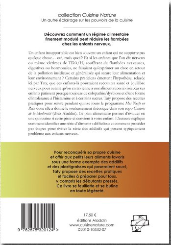 Découvrez comment un régime alimentaire finement modulé peut réduire les flambées qui, chez les enfants nerveux, se traduisent par un comportement à la limite du supportable.Un enfant insupportable est bien souvent un enfant qui ne supporte pas quelque chose... oui, mais quoi ? Et si les enfants que l'on dit nerveux ou même victimes de TDHA, souffrant de flambées nerveuses, digestives ou hormonales, ne faisaient qu'exprimer un choc en retour de la pollution insidieuse et généralisée qui sature leur alimentation et leur environnement ? Certains praticiens émettent l'hypothèse, relayée ici par Taty, que ces enfants-là pourraient recouvrer santé et équilibre nerveux pour autant qu'on en revienne à une alimentation révisée, car ces enfants pâtissent presque toujours de colopathie/dysbiose et d'une forme d'intolérance à l'histamine et à certains sucres. Taty propose des recettes pratiques pour suivre pendant quinze jours le programme Mes Nerfs en Paix dont elle a donné le soubassement théorique dans son topo Canaris de la Modernité (chez Aladdin). Ce plan alimentaire permet d'évaluer en une quinzaine si cette piste-ci convient à votre enfant. L'auteure explique comment identifier une série d'aliments « difficiles » et comment procéder par étapes pour éviter la série des additifs qui posent typiquement problème aux enfants nerveux.